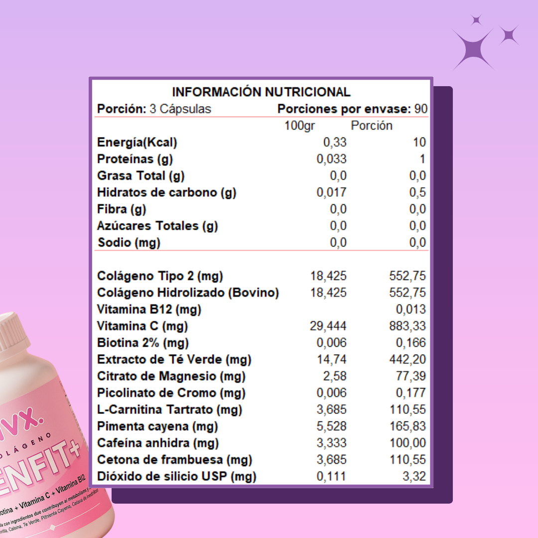 Ingredientes: Colágeno tipo 2, Colágeno Hidrolizado Bovino, Vitamina B12, Vitamina C, Biotina, Picolinato de Cromo, L-Carnitina Tartrato, Pimienta Cayena, Cafeína Anhidra, Cetona de Frambuesa, Dióxido de Silicio, Cápsula Vegetal (HPMC 100%).
