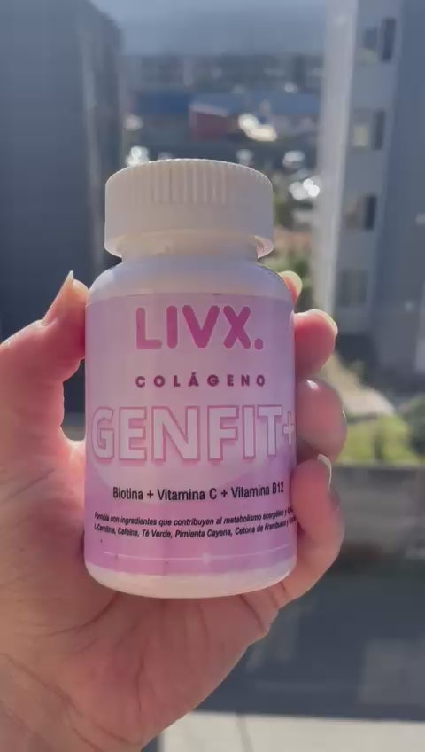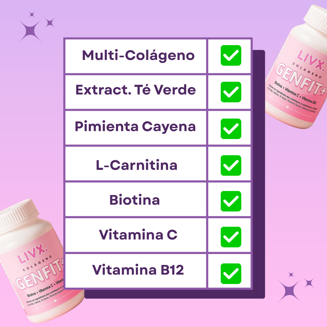 Colageno LIVX, GENFIT+, tiene diferentes tipos de colágeno con extractos que apoyan el metabolismo, como té verde, cayena y cafeína, para mantener tu energía, impulsar tus metas físicas y potenciar tu bienestar. Con biotina, B12 y cromo añadidos, es la fórmula ideal que une belleza y energía, pensada para que te veas y te sientas increíble desde el interior hacia el exterior. Todo esto pensado en un colágeno que ayude en tu metabolismo y puedas quemar grasa entre otras propiedades.